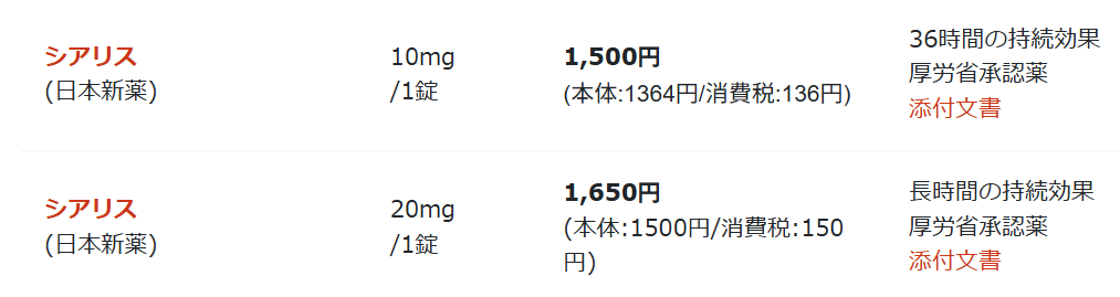 某クリニックで処方されるED薬(シアリス)の価格です。
