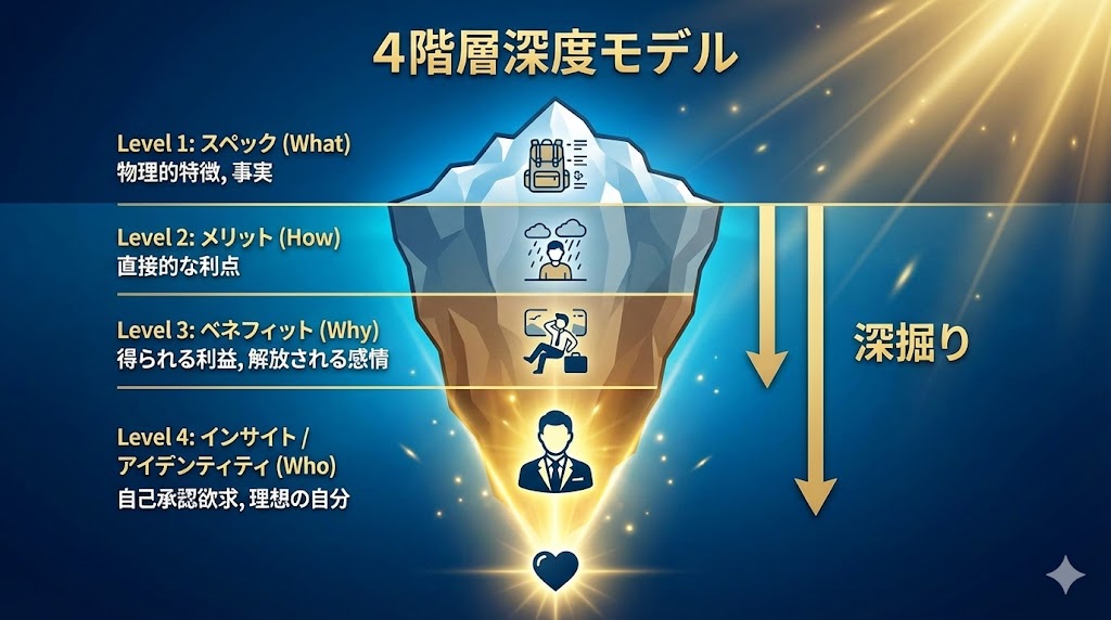 さて、ここからが本題です。 私が提唱する「4階層深度モデル」とは、商品の魅力を玉ねぎの皮をむくように深く掘り下げていくフレームワークです。