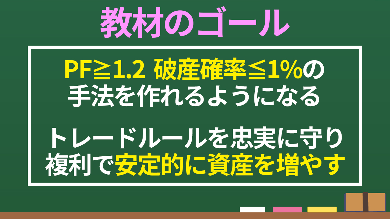 ・PFが1.2以上、破産確率1%以内の再現性のある、自分の性格やライフスタイルに合ったトレードルールを作れるようになること