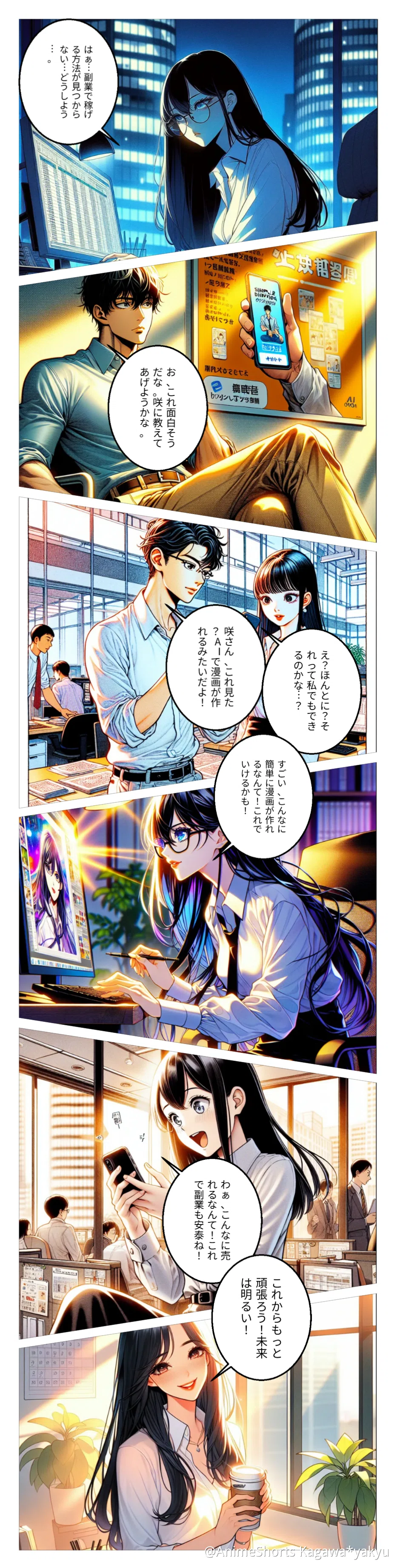 でも、そんなあなたでも大丈夫。この本で紹介するのは、「AIを使って、漫画を20分で作成し、それを収益化する」という全く新しい副業のカタチ。