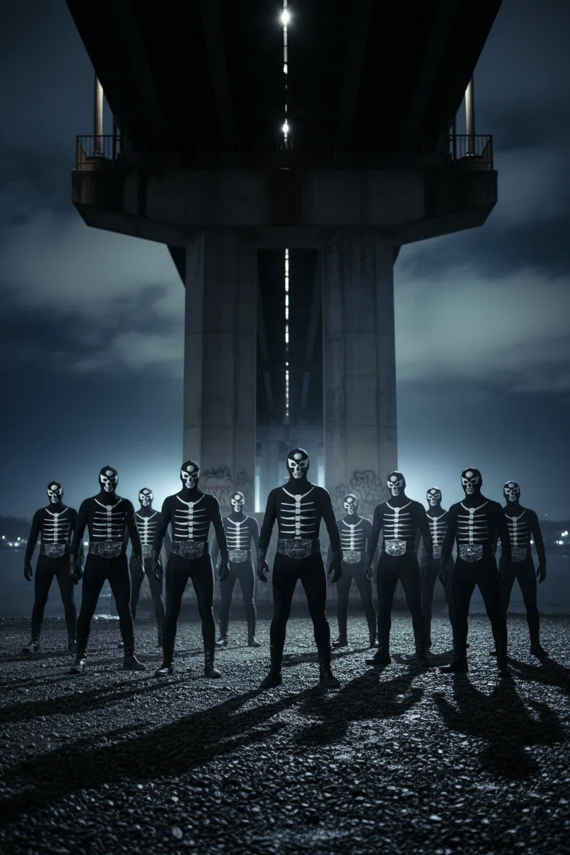 海に近い風が、塩と鉄の匂いを運ぶ。人工照明が橋脚を凍らせ、波が暗闇の皺を刻む。
