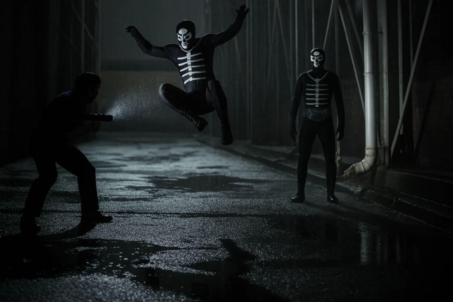 次の刹那、屋根の上で金属が鳴る。雨樋が揺れ、影が三つ――屋根から路地へと滑空した。