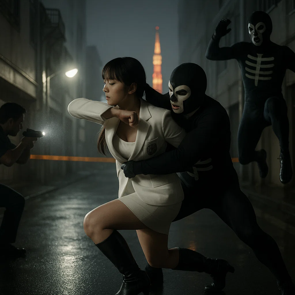 美鈴の後頭部の“センサー”がかすかに疼く。振り向かない。代わりに右足を引き、膝を落とす。背面からの抱え込みを、