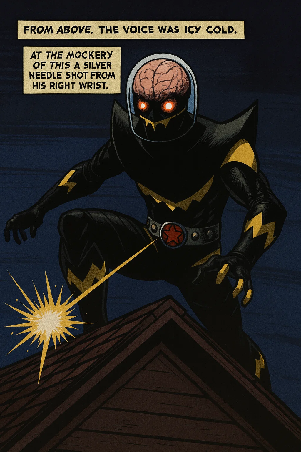 次の瞬間、ハカイダーは背中の推進ユニットで縦に跳び、屋根から屋根へ、影のような速度で追い上げてくる。