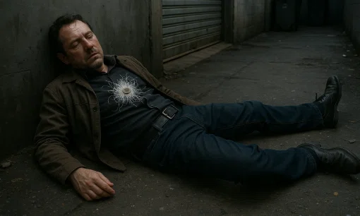 倉庫裏の路地で横たわる男は、違法兵器ブローカーとして手配中だった。胸元には、白い糸の塊が貼りついている。糸の中心には小さな金属片――円盤状のチップ。