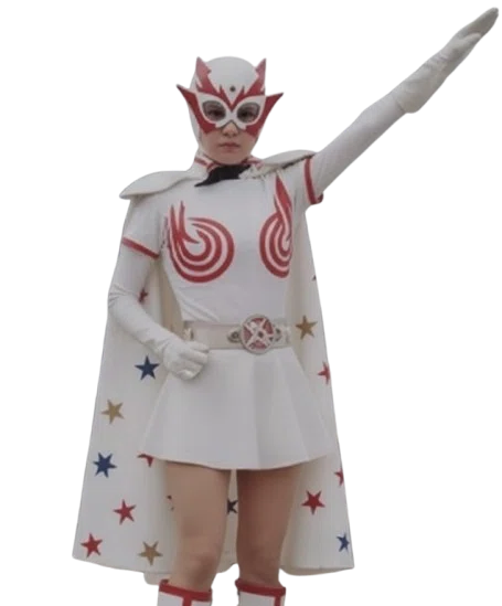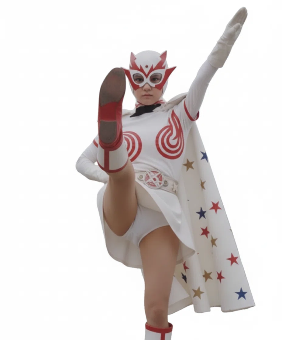 ミニスカ戦闘服に身を包み、仮面で顔を覆った女戦士。腰から伸びるベルトには紅い紋章が光を宿し、異形の力をまとっていた。