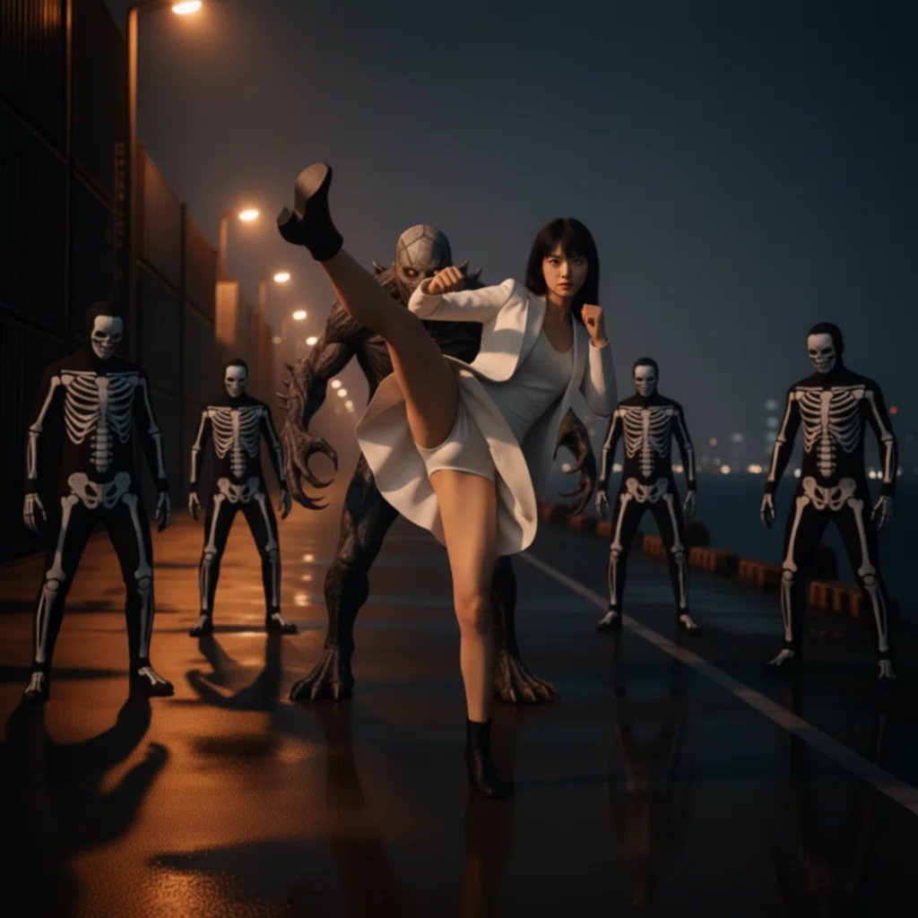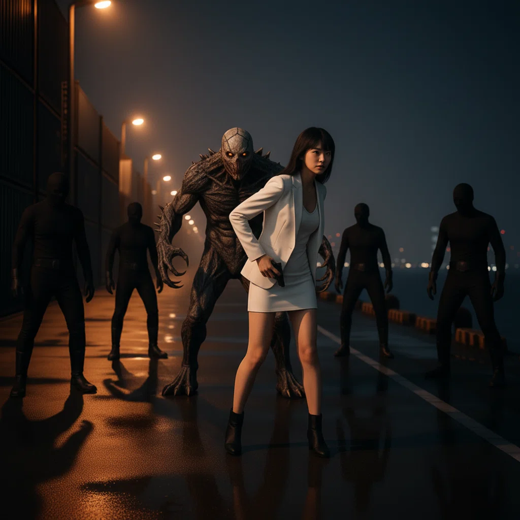 腰のホルスターに指をかけた瞬間、鋭い気配が背後から迫る。振り向くと、闇の中から現れたのは人間とは異なる輪郭――鋭い鉤爪と不気味な仮面をつけた怪人。さらに、全身を黒い戦闘服で覆った戦闘員たちが、数名、じりじりと円を描くように彼女を取り囲んだ。
