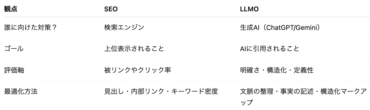 つまり、**LLMOはSEOの延長ではなく“別物”**なのです。