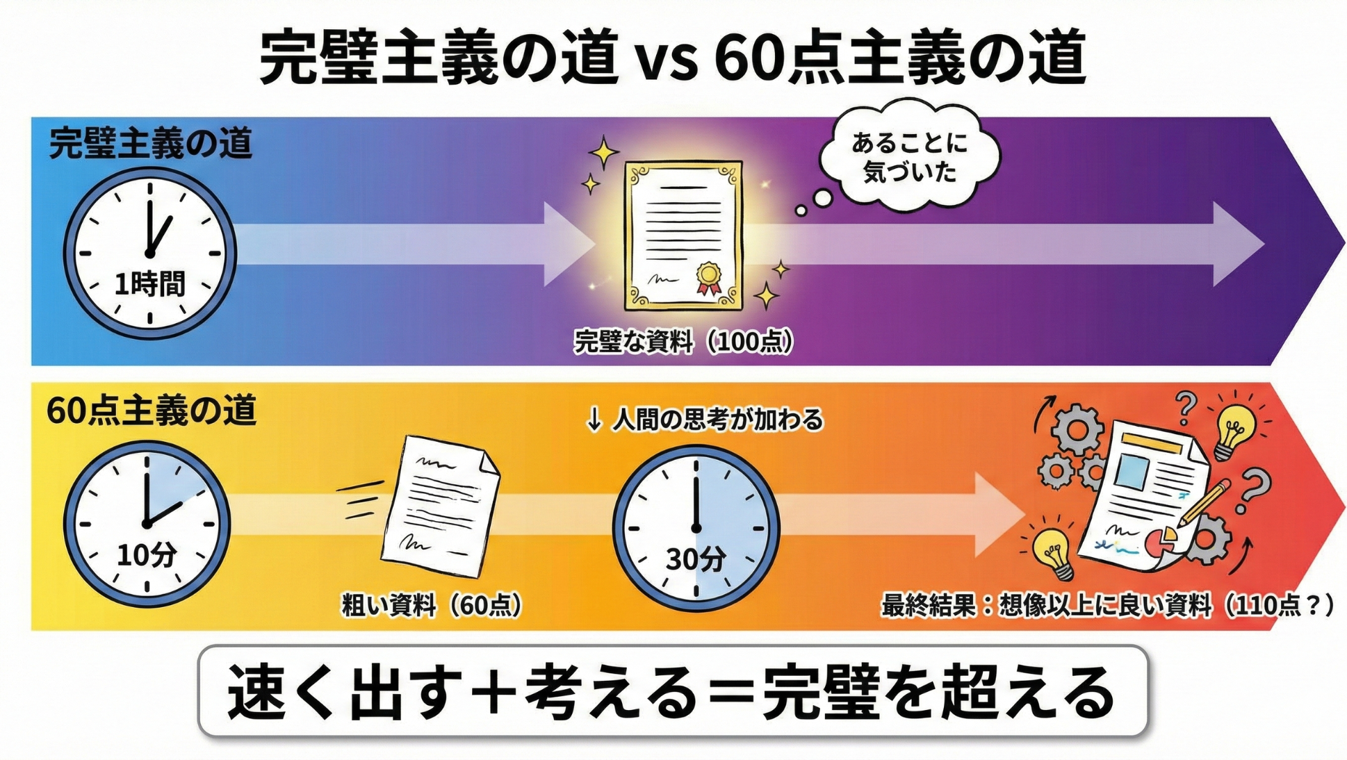 完璧なAIの出力を待つより、「60点の案を即座に出させ、あなたがそれを100点に仕上げる」方が、実はアウトプットが早く、かつ品質が高いのです。