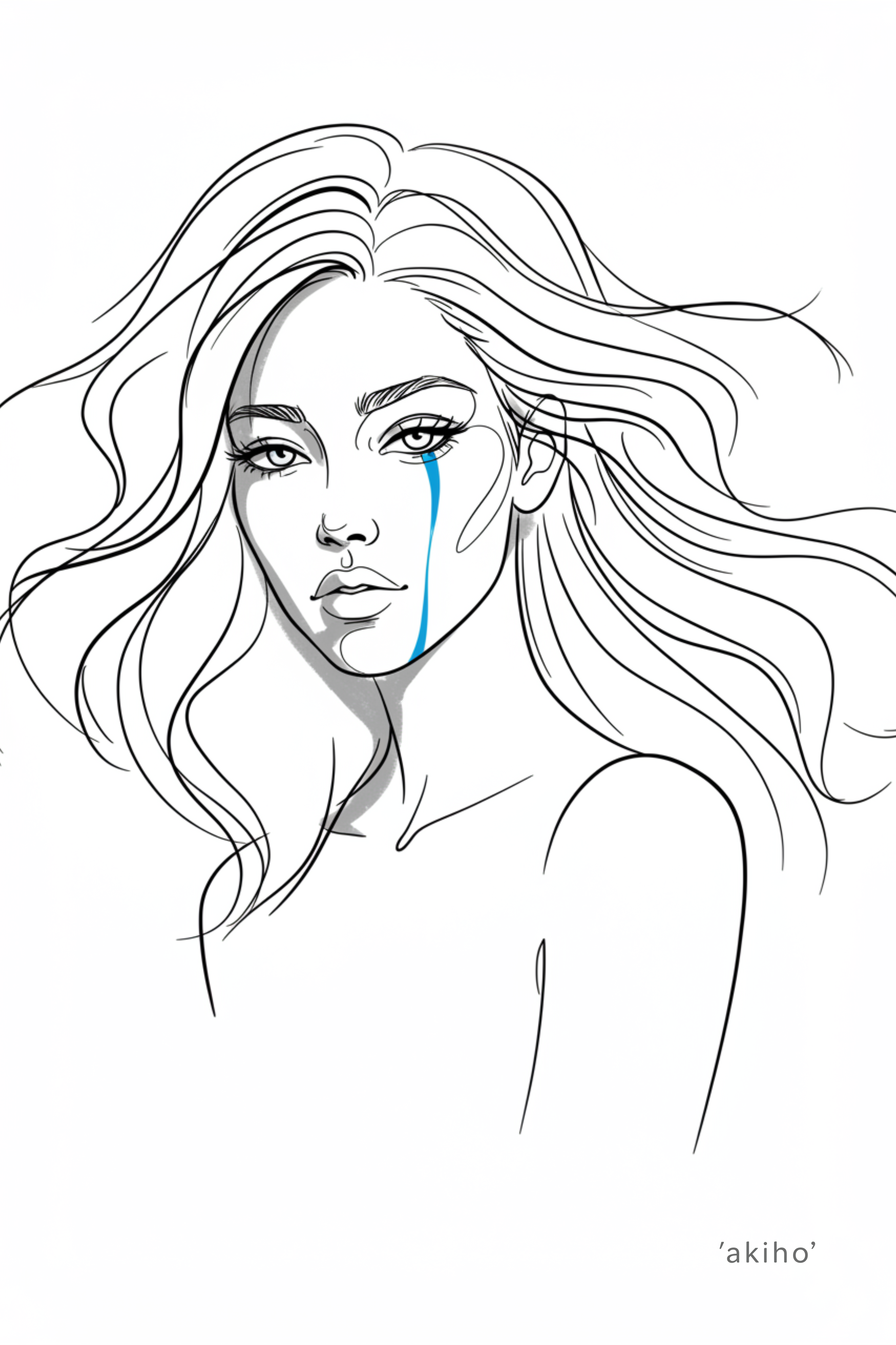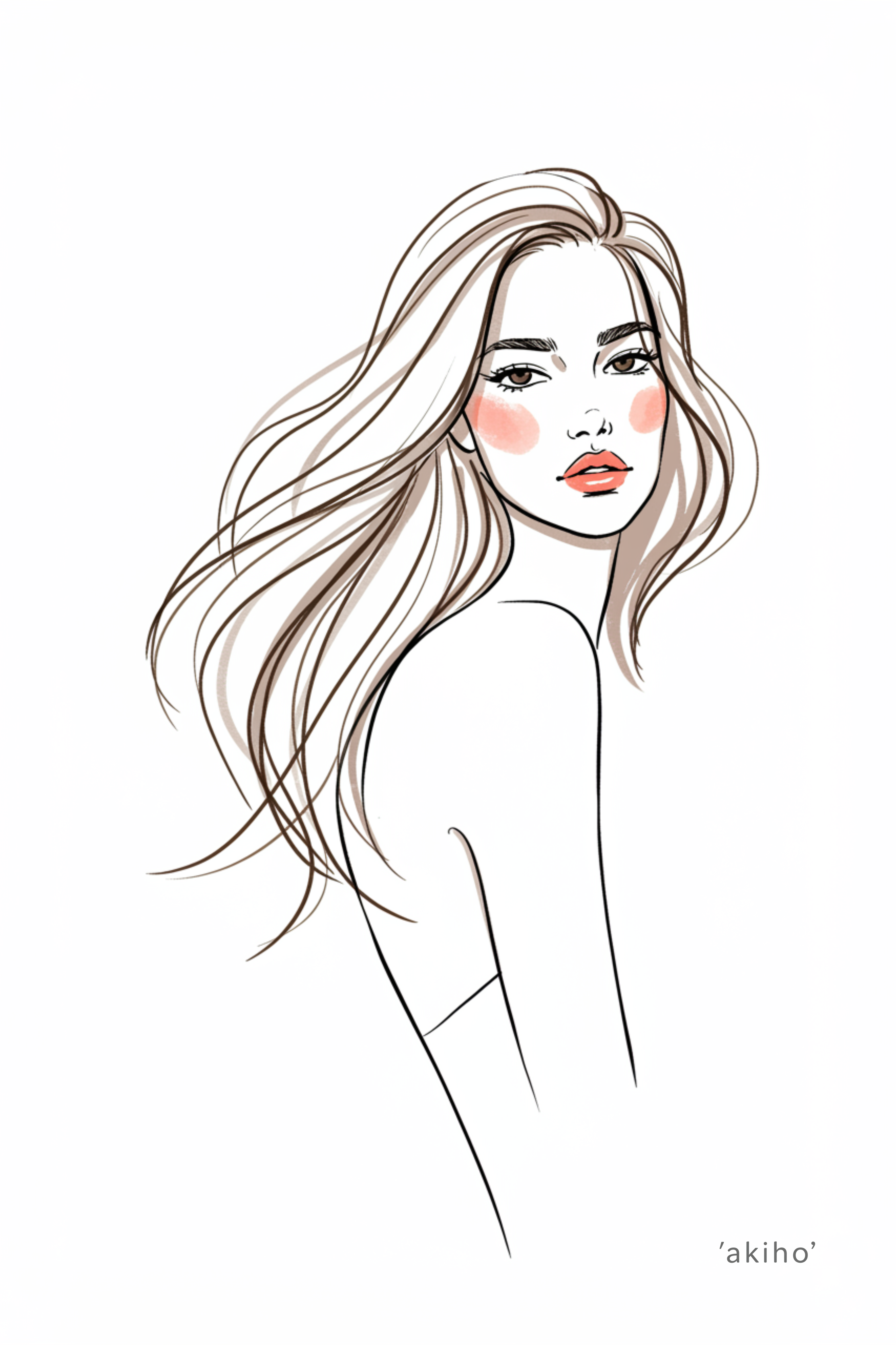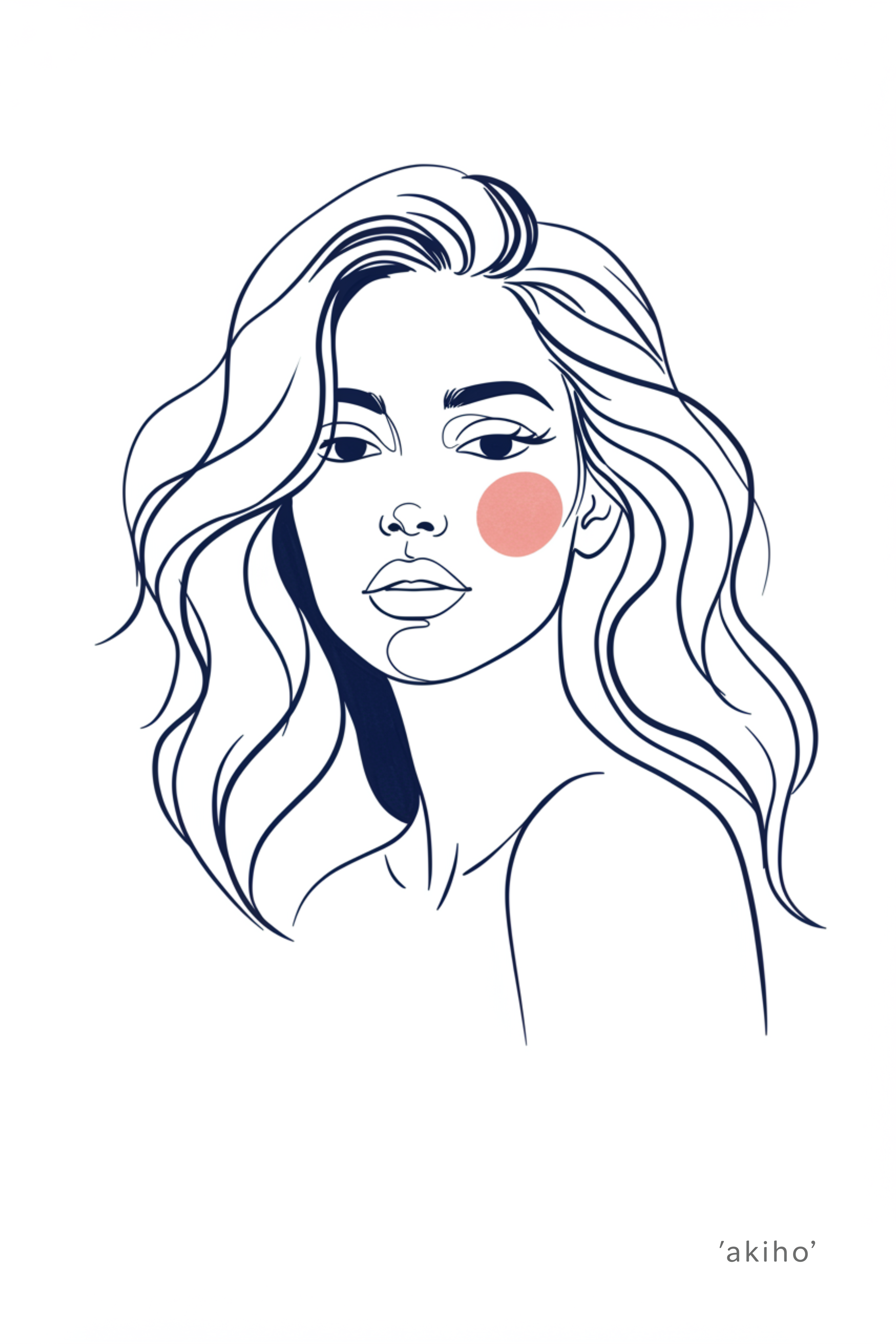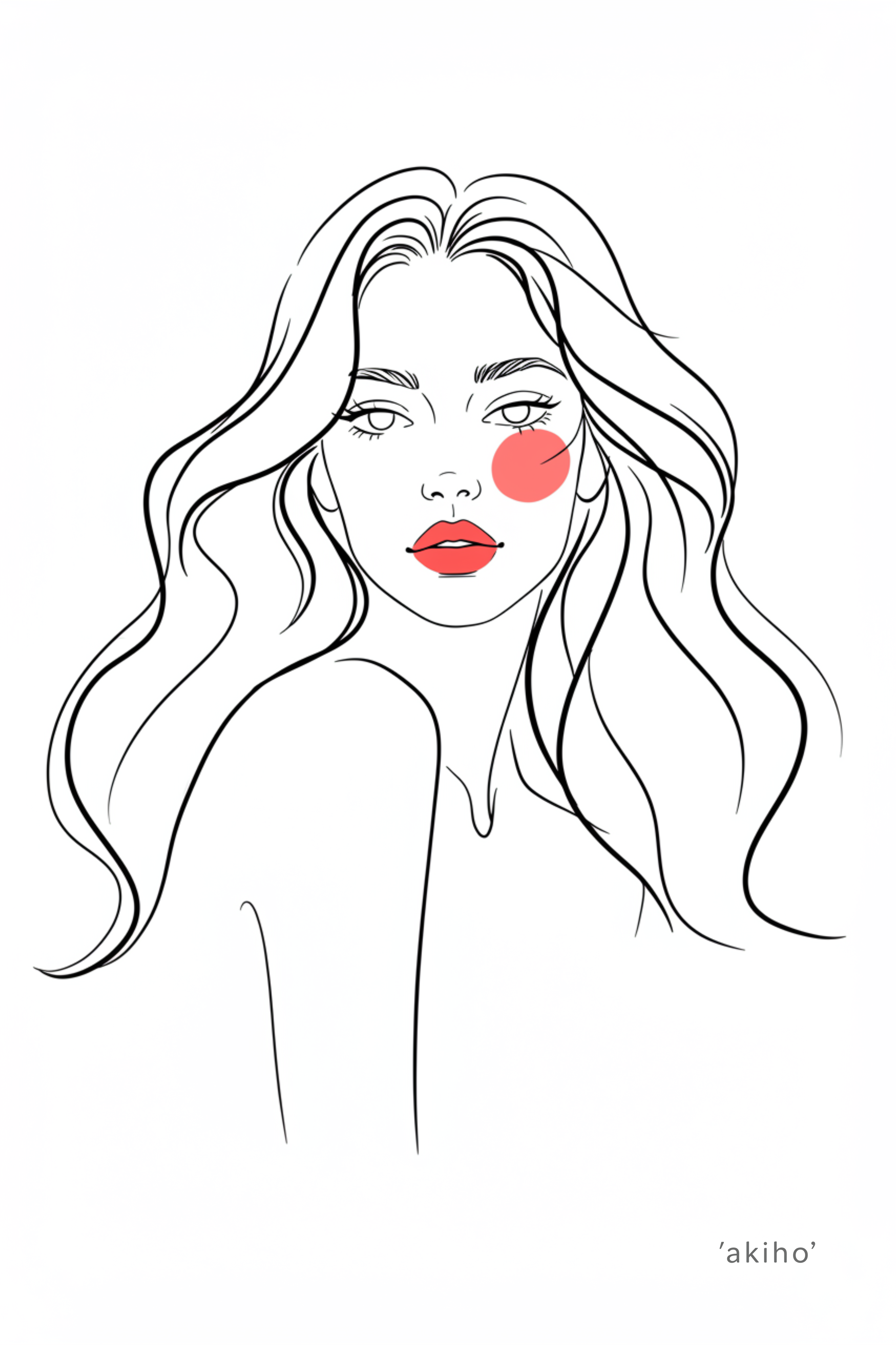 Minimalist line art illustration of a woman with flowing hair, black outlines on a white background, with a red blush circle on her cheek, elegant and fashion sketch style.