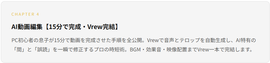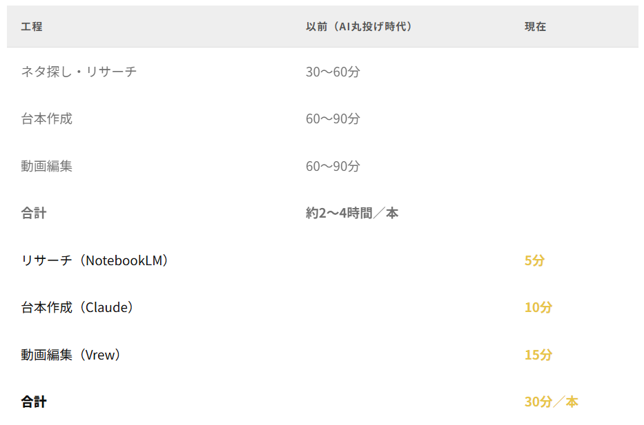 なお、20〜30分の長尺動画になると現状では30分以内に収めるのは難しくなりますが、この教材で解説しているワークフローを土台に自動化を進めていけば、長尺動画であっても30分以内で仕上げることは十分に現実的です。