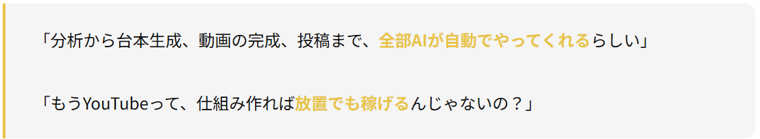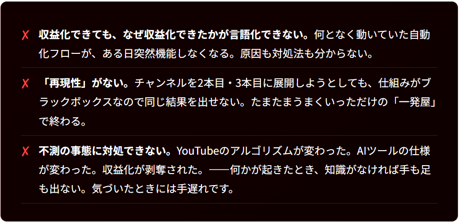 土台となる知識——「なぜこのジャンルが伸びるのか」「なぜこの台本が視聴者を引きつけるのか」「YouTubeはどう評価して動画を広めるのか」——これを理解していない人が自動化しても、出力されるのは「なんとなく作られたゴミ動画の大量生産」でしかありません。