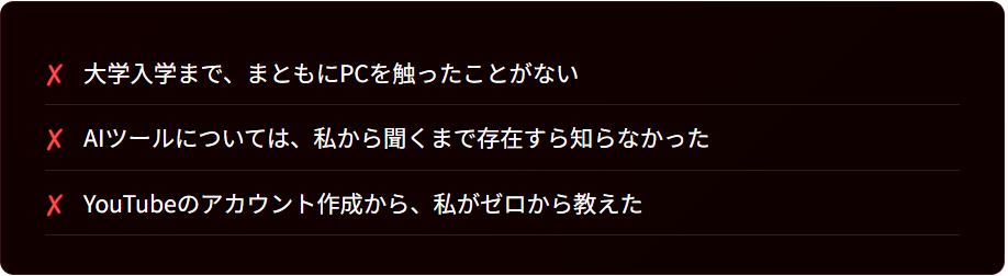 はい。私の息子は大学入学まで、まともにPCすら触ったことがありませんでした。そこから16日で収益化しています。この教材は、その息子と全く同じスタートラインにいるあなたのために作りました。