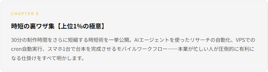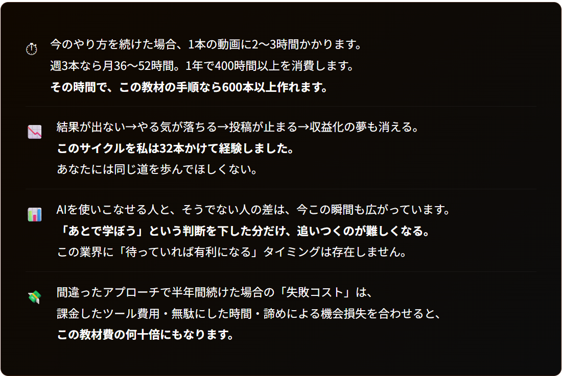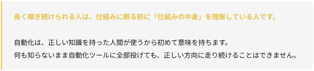 この教材は、「とにかく早く自動化したい」という方には向きません。しかし——「なぜこのやり方で稼げるのかを理解した上で、いつか自動化したい」という方には、これ以上の教材はありません。