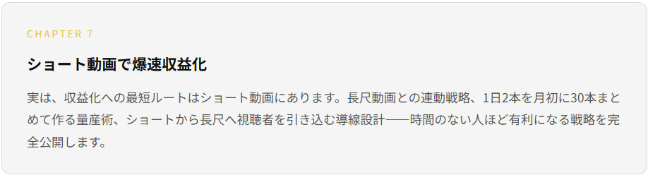私がこの教材で話すのは、たとえ広告収益条件を満たせなくても、あるいは満たした後に万が一剥奪されても、長尺動画とショート動画の両方で「広告以外の収益の柱」を立てる運営方法。