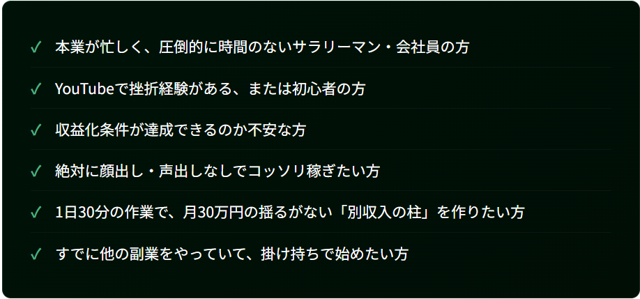顔出しなし・声出しなし・完全匿名運営が可能な設計です。チャンネル名に本名を使う必要はありません。ただし、副業収入が年間20万円を超えた場合の確定申告についてはご自身でご確認ください。