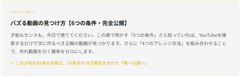 私は32本の失敗と1本の成功の違いを徹底的に分析して、その条件を「6つ」に絞り込みました。