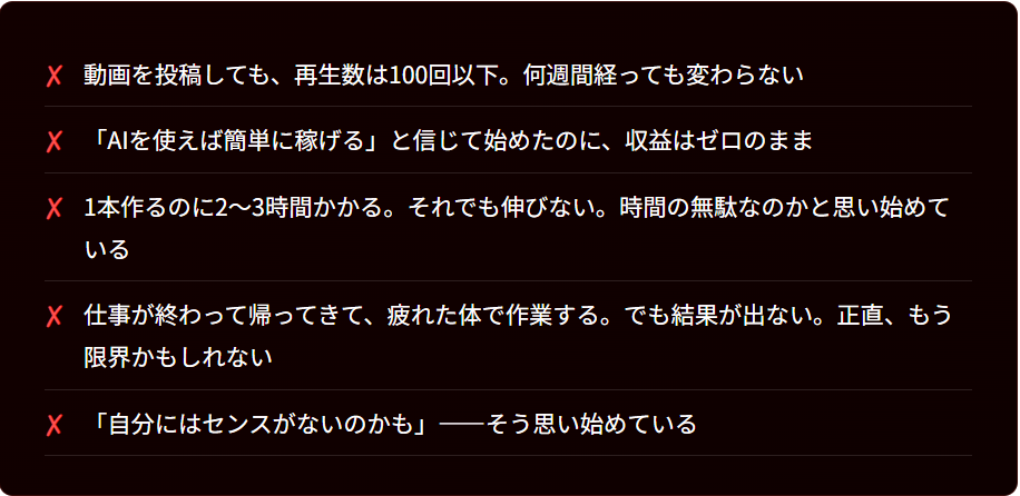 毎晩、睡眠時間を削って動画を作りながら、心の中ではずっと「どうせ今日も伸びないんだろうな」という声が聞こえていました。