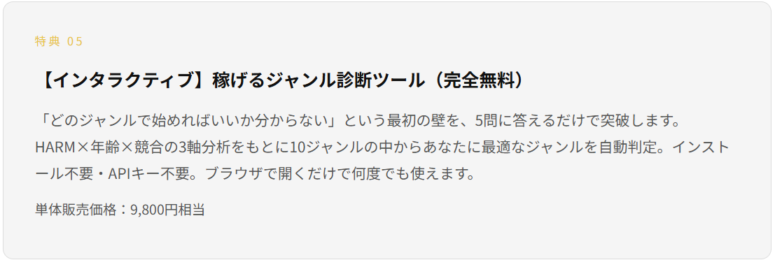 | 特典⑤:ジャンル診断ツール | 9,800円相当 |
