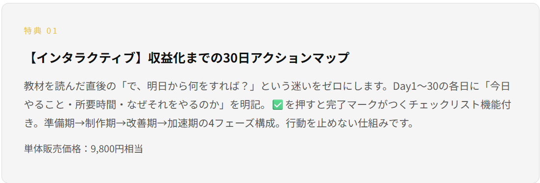| 特典①:30日アクションマップ | 9,800円相当 |