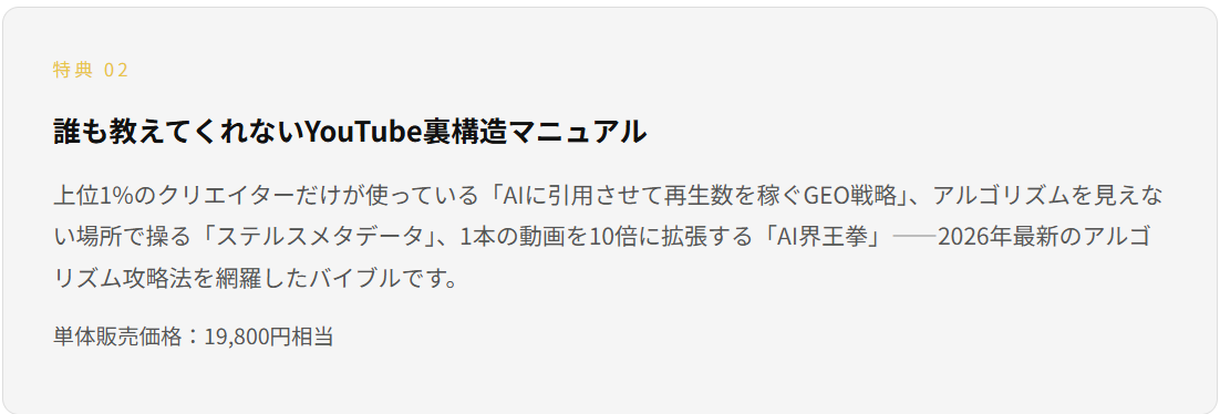 | 特典②:YouTube裏構造マニュアル | 19,800円相当 |