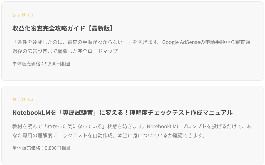 | おまけ②:NotebookLM理解度テスト作成マニュアル | 9,800円相当 |