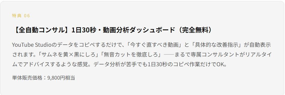 | 特典⑥:動画分析ダッシュボード | 9,800円相当 |