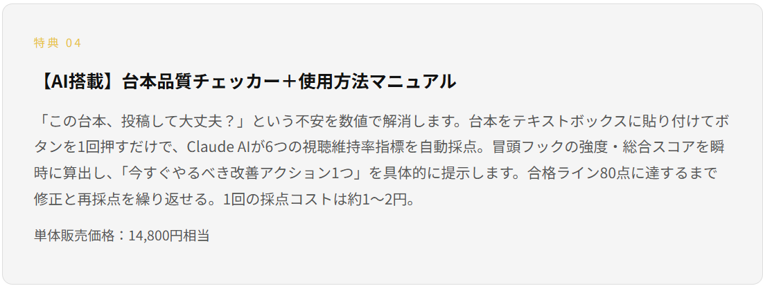 | 特典④:台本品質チェッカー | 14,800円相当 |