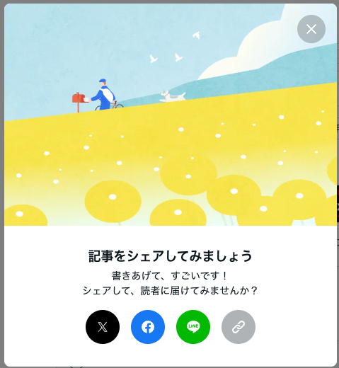 noteで記事を投稿すると、こんなシェア画面が出てきますよね。