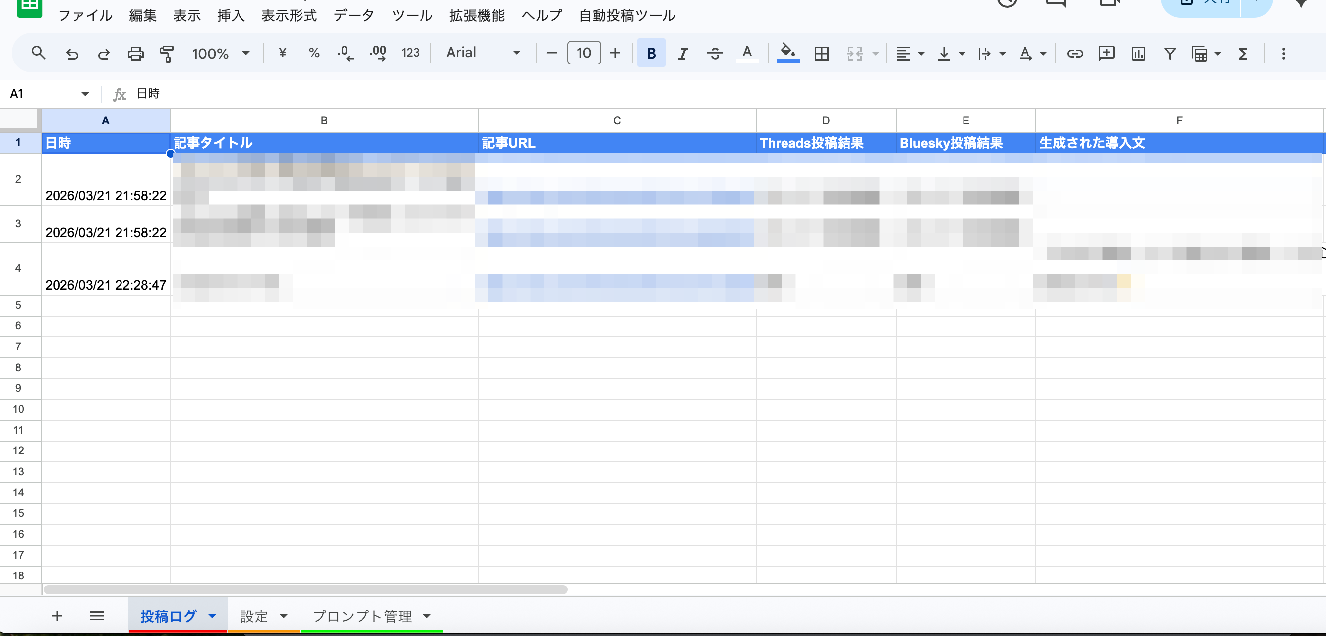 ThreadsもBlueskyも、スプレッドシートの設定をON/OFFするだけで投稿先を切り替えられます。「今はBlueskyだけ運用している」という方も、片方だけで使えます。