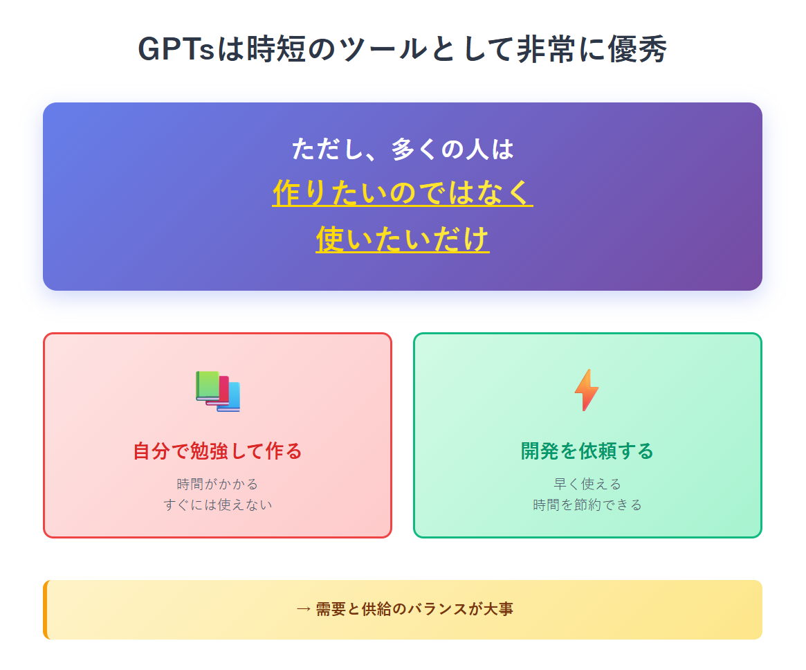 ただし、 多くの人は「作りたい」わけではなく、「使いたい」だけなんです。 なぜなら、自分で勉強してGPTsを作る時間があるなら、開発を依頼してしまった方が早いから。 そこに需要と供給のバランスが生まれています。