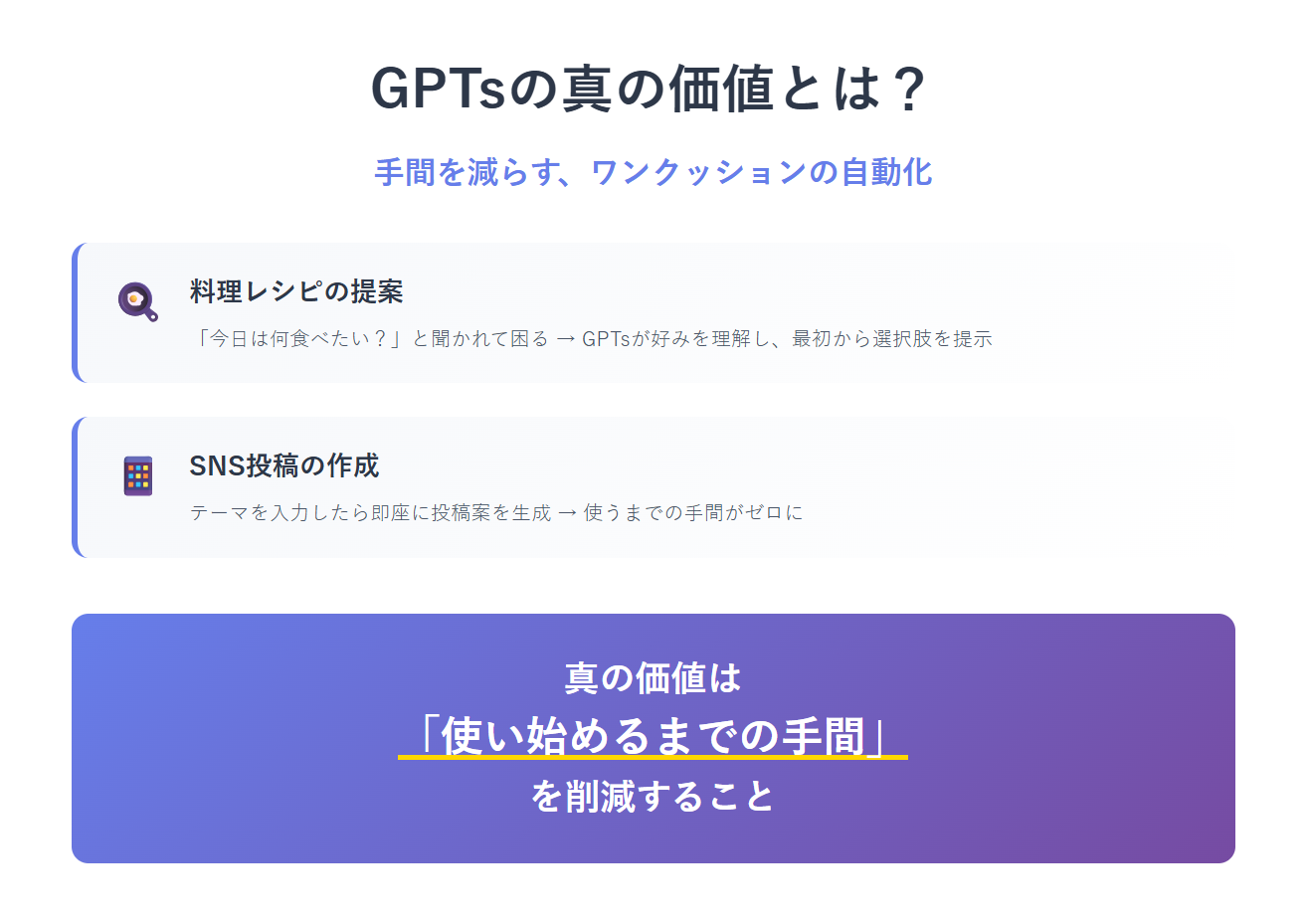 前述の通り、GPTsはあくまで時短のための手段にすぎません。 ショート動画の台本を作るGPTsがあったとしても、