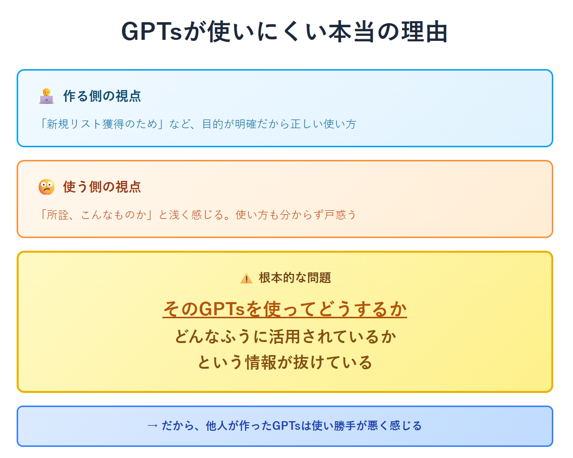 これGPTsの使い方として発信者の立場から見れば正解なんです。GPTsは目的の為の手段にすぎず、この場合なら「新規リスト獲得のための仕組み」としての使い方は正しい。ですが、GPTsを受け取った人から見れば「所詮、こんなものか」と浅さを感じるのも当然です。