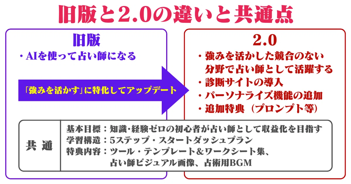 1. コンセプトの進化:「あなただけの専門性(ニッチ)の発見」が中心に旧版が「AIを使って占い師になる」という汎用的なロードマップだったのに対し、2.0では「AIを使って、あなただけのニッチな強みを発見し、競合のいない分野で専門家として輝く」というコンセプトに進化しています。旧版: 未経験からAI占い師になり、月10万円を目指す。2.0: 個人の「好き」と占いを掛け合わせた独自の専門分野をAIと共に発見することを最重要視しています。