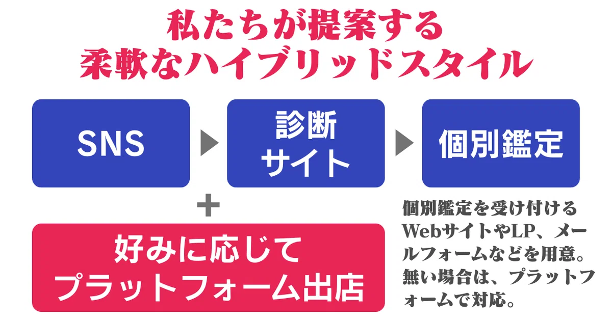 私たちが提案するのは、「SNS + 診断サイト + 好みに応じてプラットフォーム出店 → 個別鑑定」という柔軟なハイブリッドスタイルです。