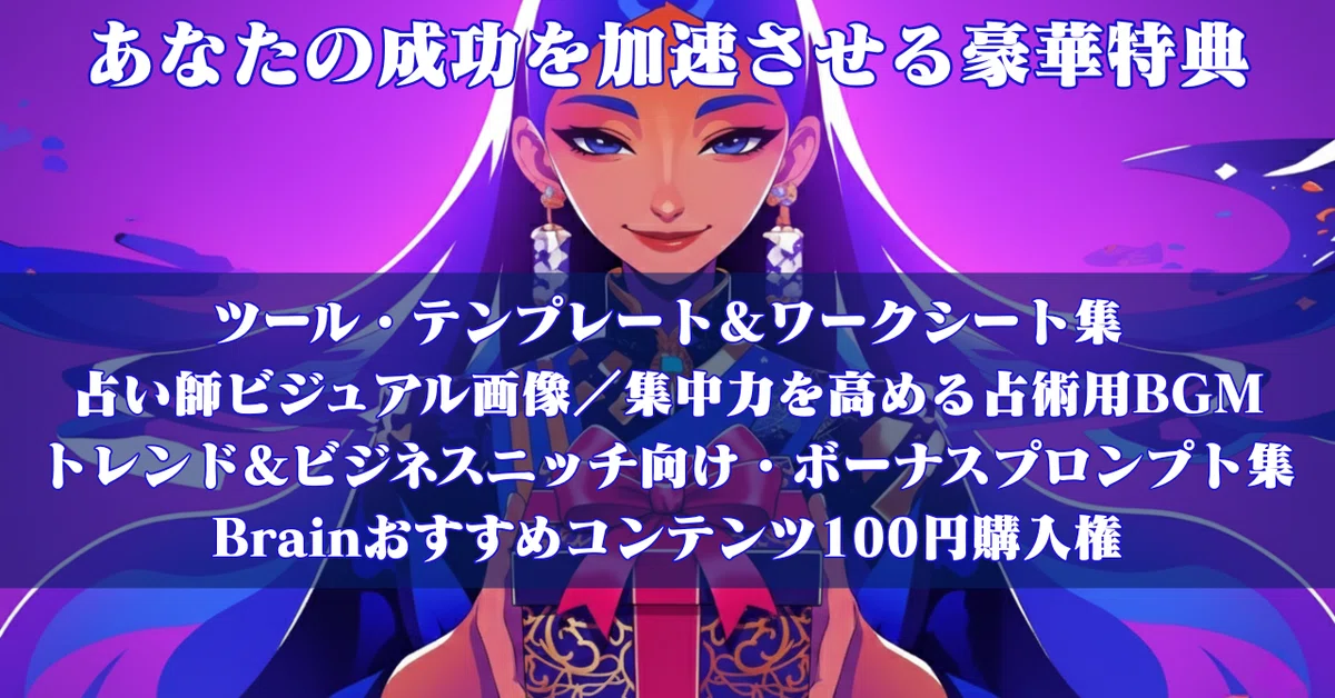 3. 特典内容(一部共通・一部アップグレード)購入者(2.0ではコメント投稿者限定)に提供される特典には、共通のものが多く含まれています。ツール・テンプレート&ワークシート集: 活動をサポートする各種テンプレートやワークシートが提供される点は共通です。占術用BGM: 集中力を高めるソルフェジオ周波数のBGMは同じ内容です。占い師ビジュアル画像: アバターに使える画像集も変更はありませんが、記事内に画像生成AIで作成するポイントを紹介します。