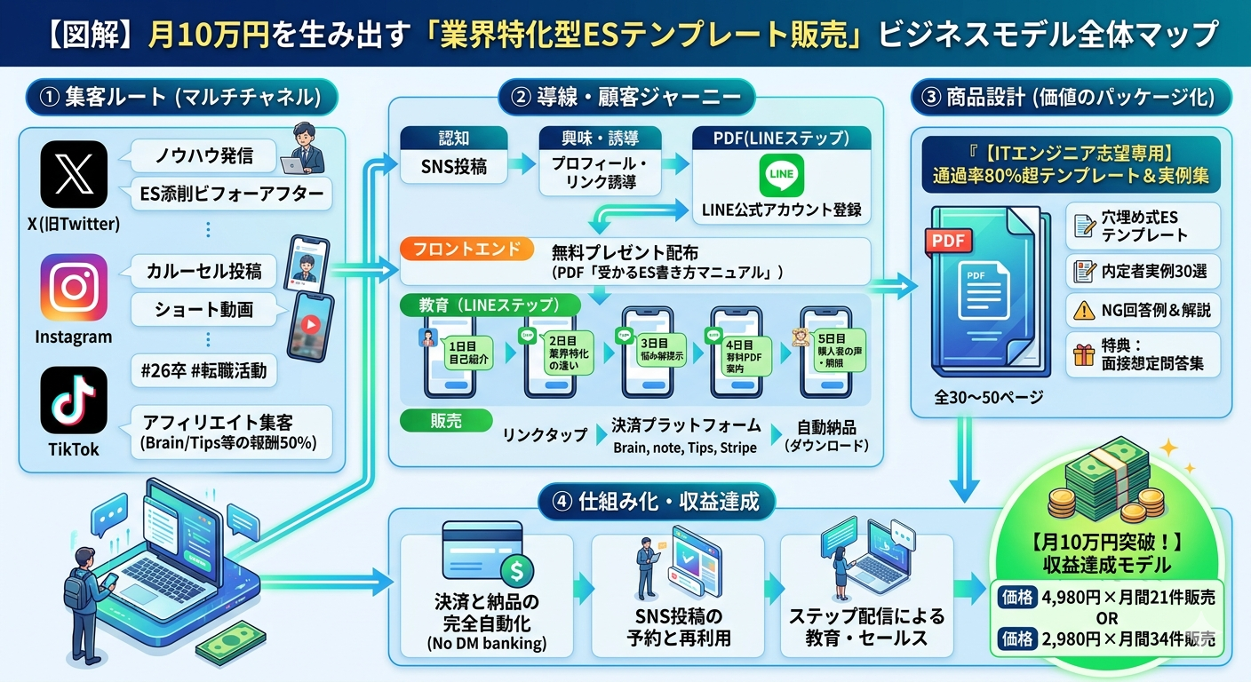 特定の業界(例:ITエンジニア、総合商社、外資系コンサルなど)に特化したESテンプレートと通過実例集をPDF化し、SNSとLINEのステップ配信を活用して自動販売する仕組み。