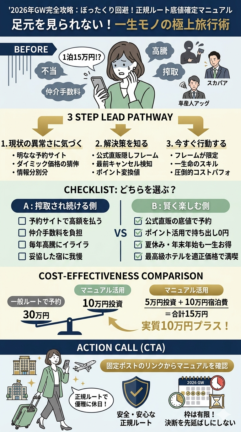 私はこれまで、この正規ルートを使って数え切れないほどの極上ステイを適正価格で実現してきました。そして今回、この異常なまでの価格高騰に悩む方のために、私が実践しているすべての手順を一つの完全なマニュアルとしてまとめました。それが『2026年GW完全攻略・正規ルート底値確定マニュアル』です。