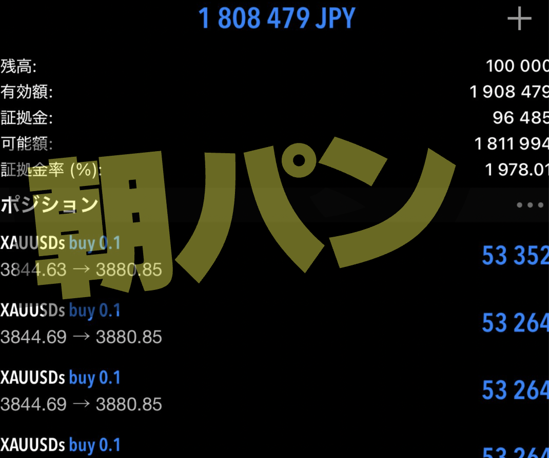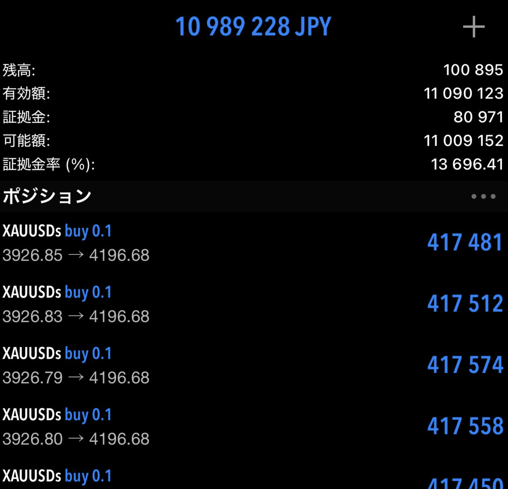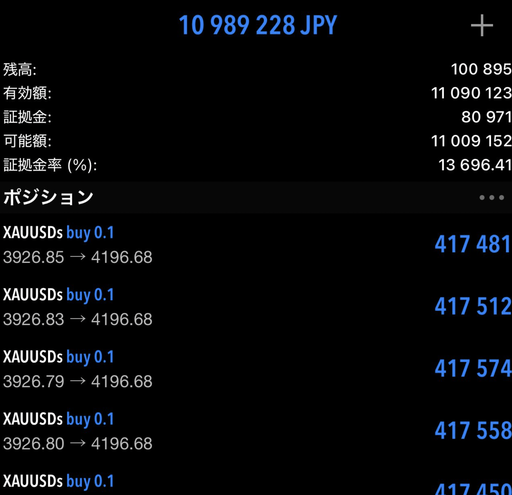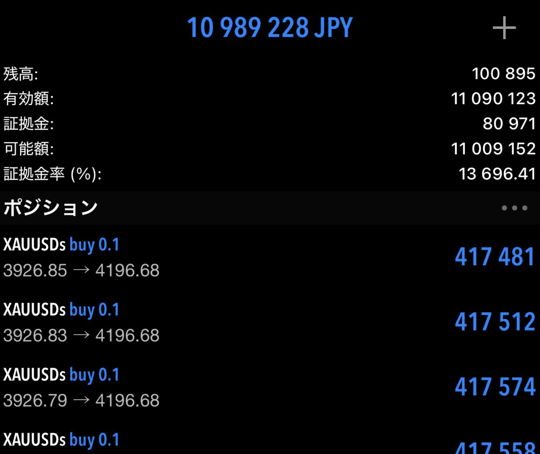 毎回こんな大きな金額を取れることはないので、普段は10万円を10倍以上にするトレードをちまちま繰り返しています。
