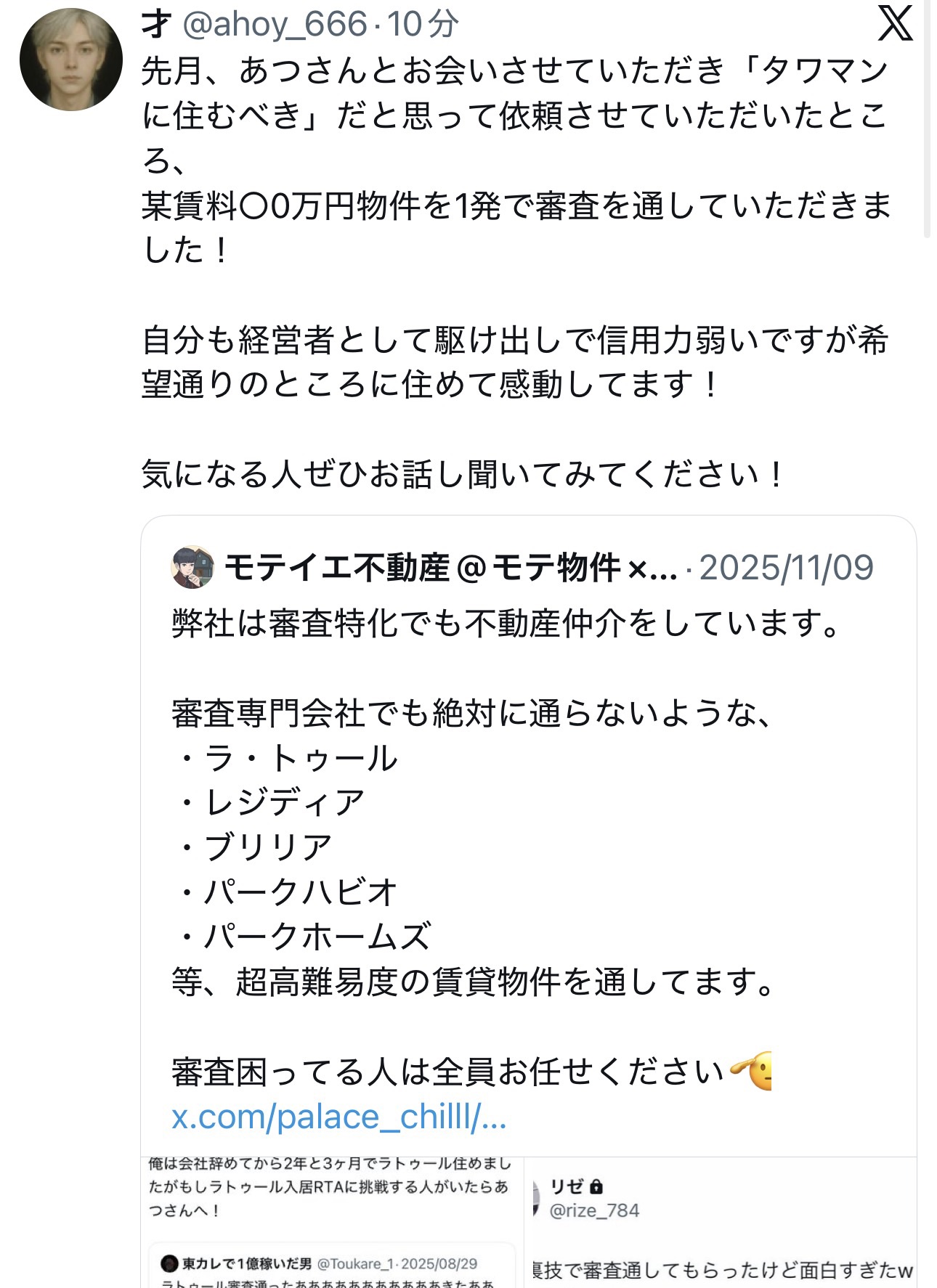 今自分が代表を務めるハイメンズ不動産では高級賃貸の審査特化でサービスを行ってますので、信用力がなくてもタワマンやハイグレードレジデンスに住みたい等の希望がある方は是非一度ご相談ください。自信をもって確実に喜んでもらえるサービスになってるかと思います👍