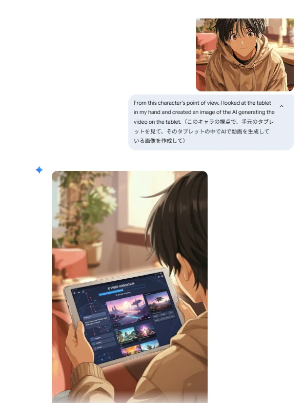 このキャラの視点で手元のタブレットを見て、そのタブレットの中でAIで動画を生成してる画像を作成して