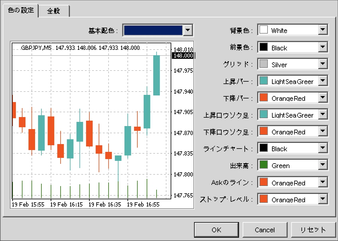 背景色やローソクの色は、チャート画面を右クリック→「プロパティ」で設定可能です。