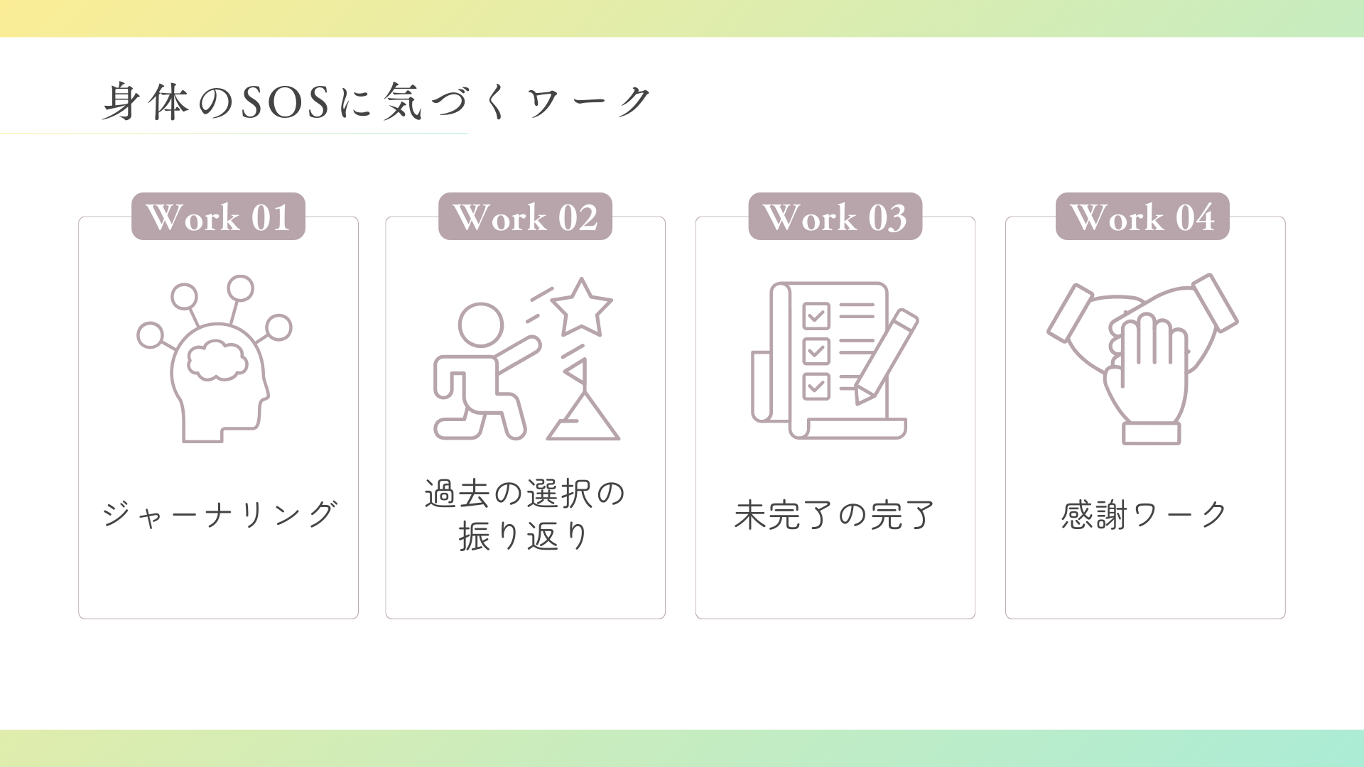 余談を挟みましたが改めて、自分が何を感じ、何を想い、何を選択していくのか。それを聞く時間を確保することはわたしにとって重要であり、自分についてきちんと理解しておかないと、身体のSOSにも気づけないし、ただただモヤモヤが膨らんでいくだけ、を痛感しました。