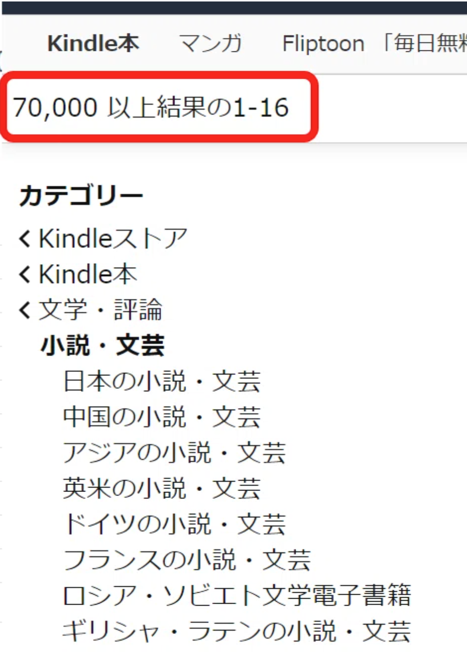 Kindleストアの文学・評論(第一階層)の小説文芸(第二階層)のカテゴリーには7万冊以上の本が登録されている。ということです。