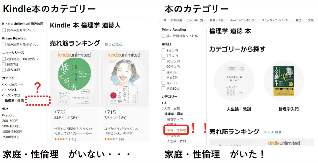 <Kindle本のカテゴリー>では選ぶことができても、Kindle本のカテゴリーには【家庭・性倫理】自体が存在しません。
