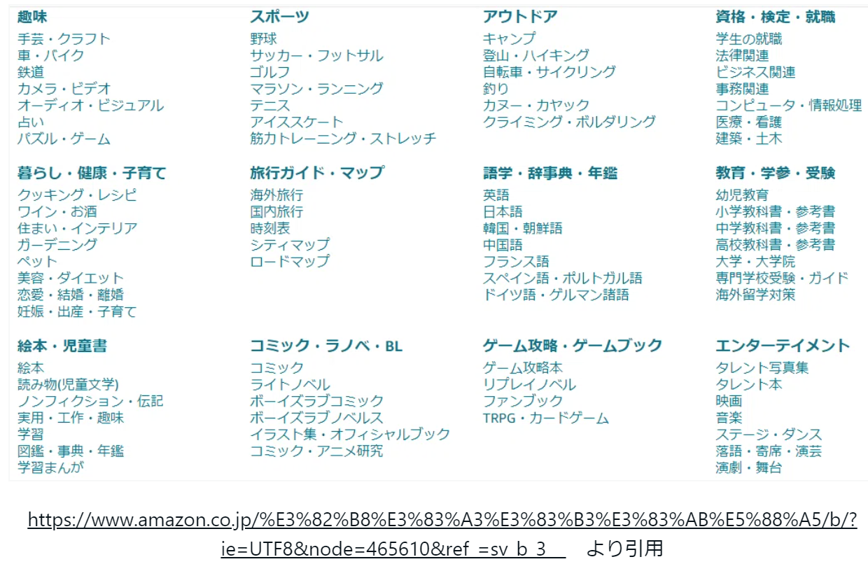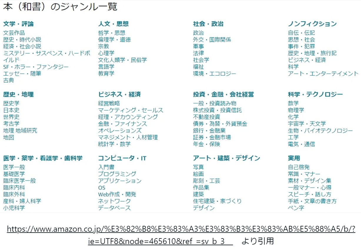 少し話が脱線してしまいました……下記に本のカテゴリーの一覧を提示しておきます。