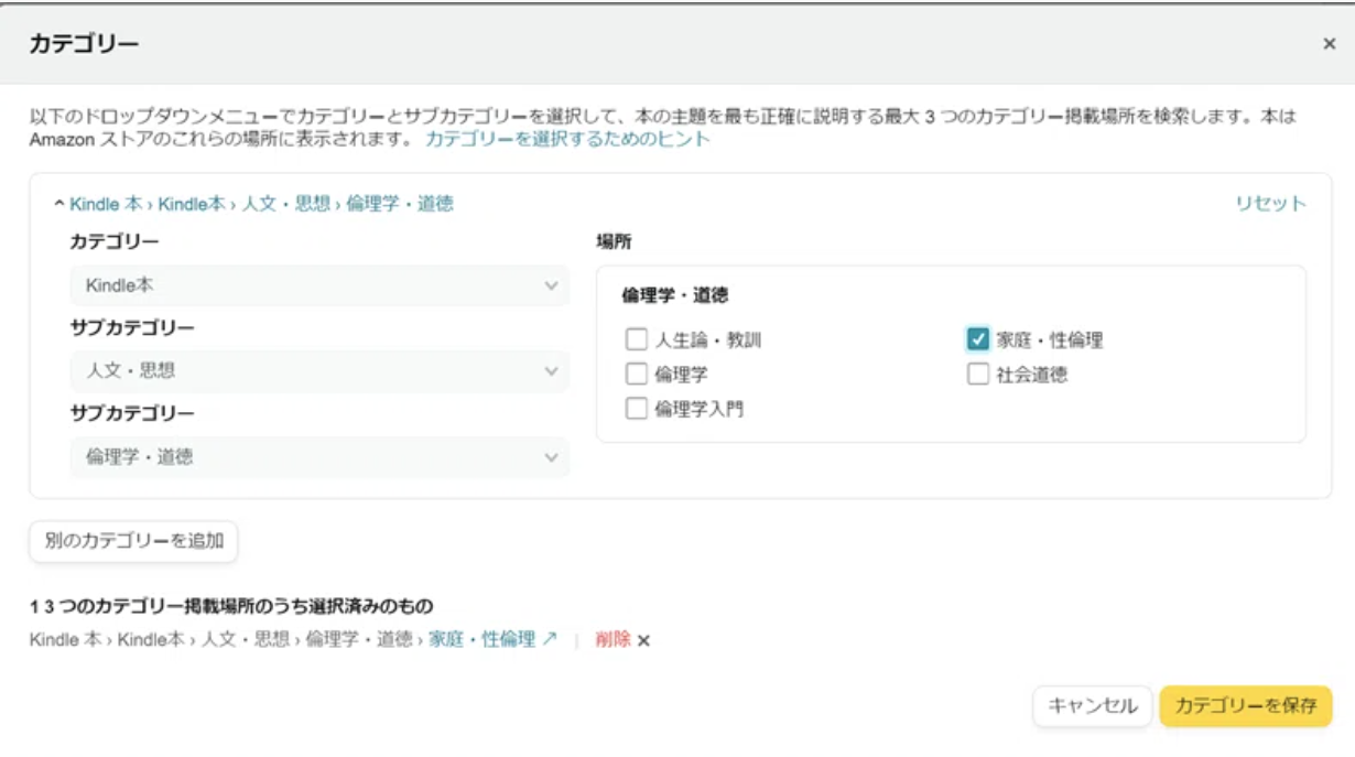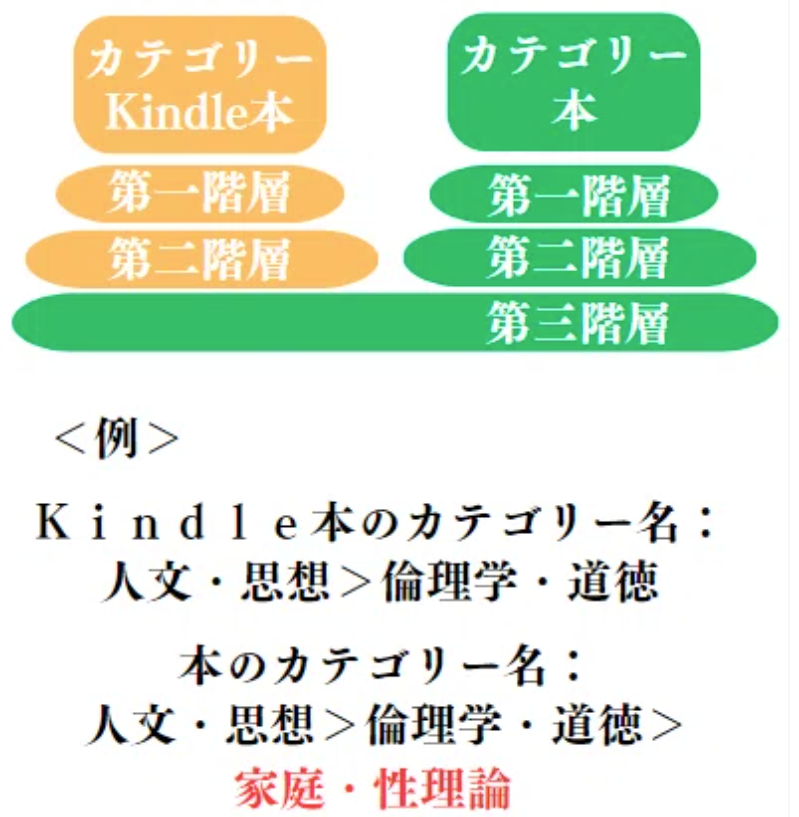Kindle本のカテゴリーですと第二階層までしかありませんが、本のカテゴリーですと第三階層まであります。今はありませんが、僕の本も家庭・性理論のカテゴリーにいたこともあります。