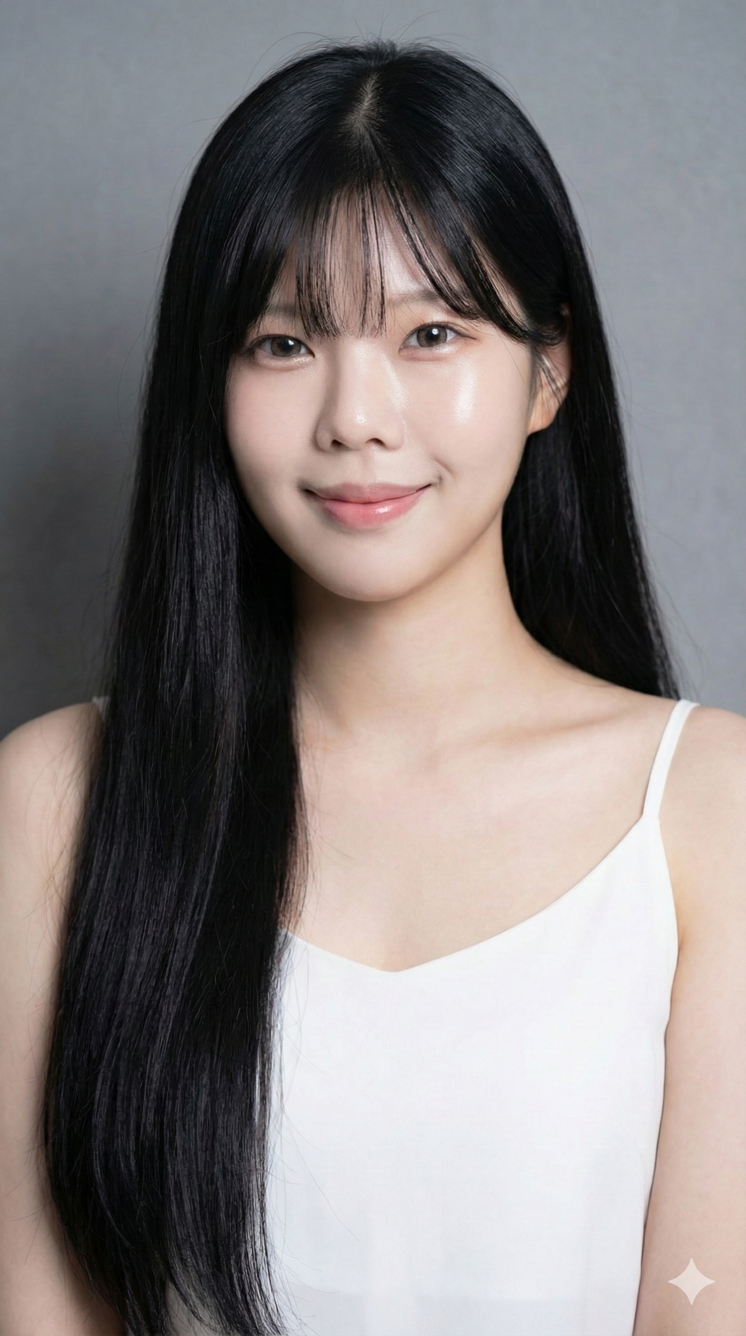 清楚でナチュラルな雰囲気の韓国アイドル風の男性。透き通るような白い肌で、自然な黒髪のストレートヘアはセンター分けの長さ。ふんわりとした前髪。やわらかく微笑んだ表情で、肌は艶やか。シンプルな黒い無地の服を着て、背景はグレーのスタジオ風。自然光ライティングで、落ち着いた雰囲気のポートレート