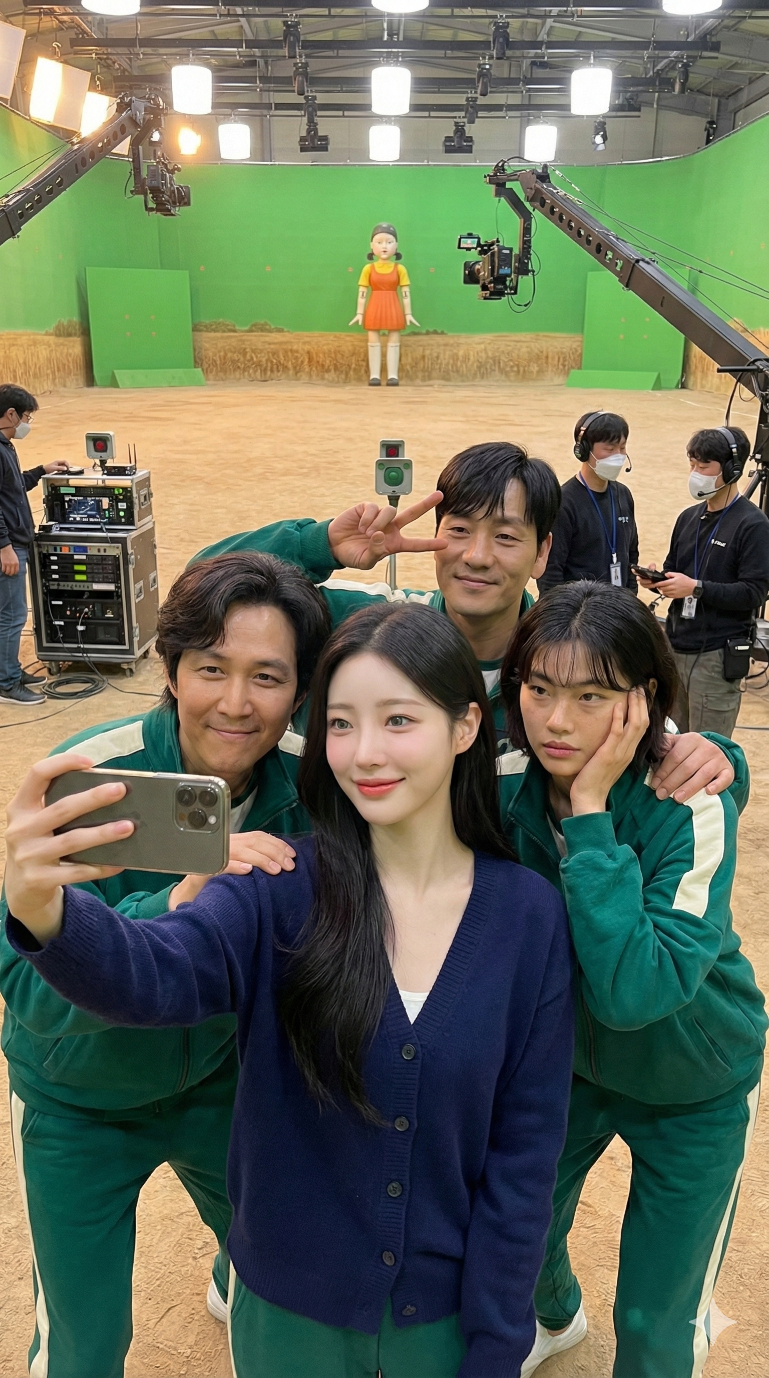 画像の女性が、映画の撮影現場で主人公たちと一緒に仲良くセルフィー(自撮り)を撮っているような写真を作成したいです。