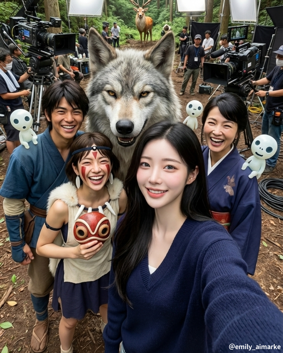 背景は『もののけ姫』の野外撮影現場という設定で、実際の撮影風景のようにリアルに見せてください。